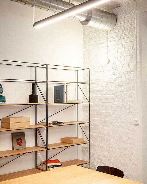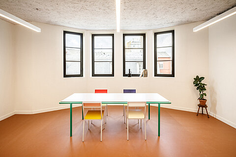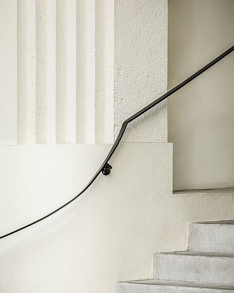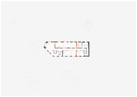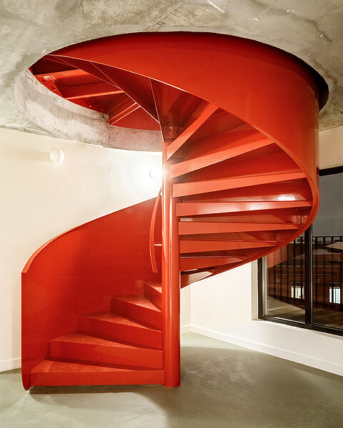 Une attention particulière est prêtée à la déambulation entre les différents niveaux. Deux escaliers hélicoïdaux s’ajoutent, en complément des circulations verticales existantes, pour relier le rez-de-chaussée au premier sous-sol et le toit-terrasse au dernier étage. Ces deux escaliers métalliques évoquent la légèreté, tandis que leur couleur rouge vif les rend repérables et invite l’usager à les emprunter.