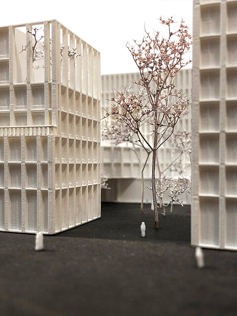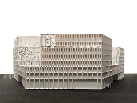 L’organisation fonctionnelle du bâtiment vise à offrir des espaces flexibles, modulables et innovants, ayant la possibilité d’évoluer à travers le temps. Le rez-de-chaussée accueille des lieux de vie, de bien-être et de détente. Les halls sont traversants, afin d’y aménager des porosités visuelles et physiques avec le cœur d’îlot. Enfin, chacune des trois émergences est surmontée d’un étage technique venant couronner la composition de la façade.