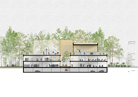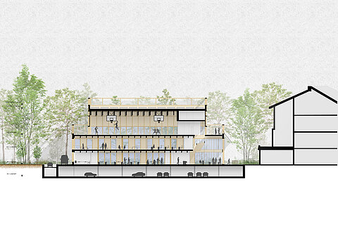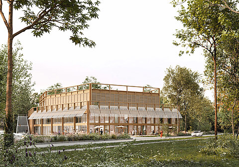 Le projet vient s’inscrire dans une démarche à faible empreinte environnementale. Cela passe à la fois par la compacité associée à une enveloppe thermique performante, mais aussi par l’intégration de matériaux biosourcés et le réemploi de matériaux sur site et hors site. Afin d'entrer dans l’objectif 2050 du décret tertiaire et d’une labellisation Passivhaus, il est fondamental de travailler sur la qualité de l’enveloppe tout en réduisant l’empreinte carbone du bâtiment, avant de devoir recourir à des systèmes actifs complexes à l’utilisation et coûteux pour l’exploitant et notre environnement : économiser les matières et les matériaux, utiliser du bois dans la construction, concevoir low-tech (performance des systèmes) et réduire la consommation énergétique. Par l’intégration de matériaux biosourcés, nous souhaitons atteindre le Label biosourcé proche du niveau 2.