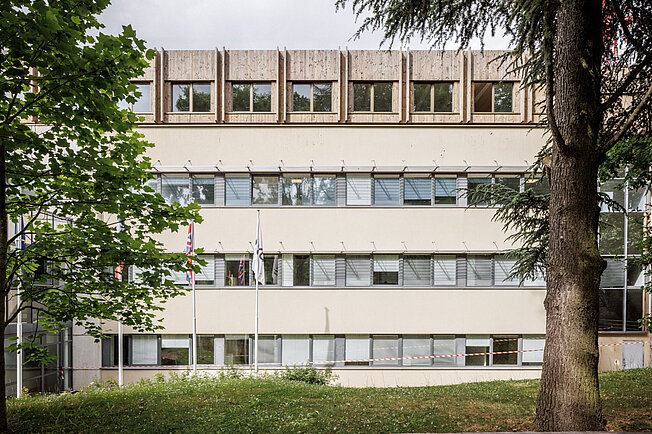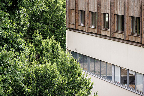 Les surélévations reposent sur les toitures-terrasses des ailes A et B et se connectent aux niveaux inférieurs existants, par leur structure et leurs noyaux de circulation verticale. Elles se façonnent dans la continuité des corps de bâtiments existants, en étendant la géométrie des pilastres habillés en pierre. En retrait des acrotères conservés, elles proposent un geste léger et délicat pour minimiser les appuis sur les constructions des ailes A et B. Un système de poteaux moisants et de poutres moisées en bois fin rythme les façades. La structure et le système menuisier se dédoublent de la trame du bâtiment Prouvé et Coulon, conférant à l’élancement du dispositif. L’emploi du bois pré grisé apaise l’aspect contrasté des façades existantes et s'accorde à son contexte densément boisé.