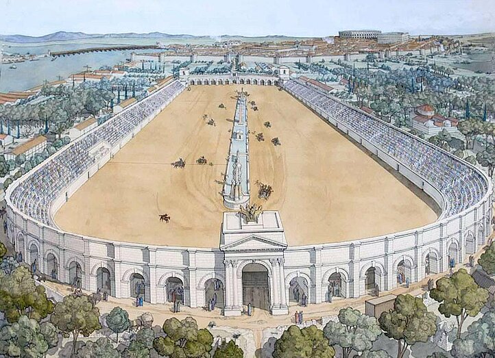 Iconographie : Dessin de Jean-Claude Golvin, el circo en el siglo IV, Arles