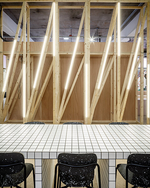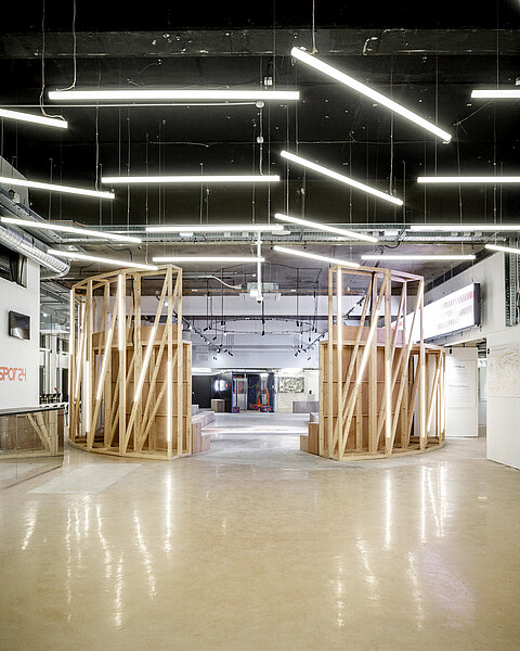 Notre exigence est également celle d’entrevoir les potentialités de l’architecture existante d’une manière pérenne et attentive pour envisager « l’après ». Les dispositifs architecturaux et mobiliers mis en place dans ce projet temporaire sont fabriqués à partir de matériaux de récupération ou géo-sourcés, tel que le bois. Réutilisés, reconditionnés, réemployés, cette substance préfigure le projet de demain.