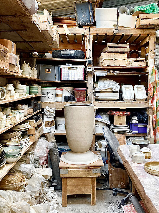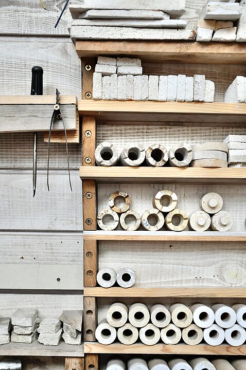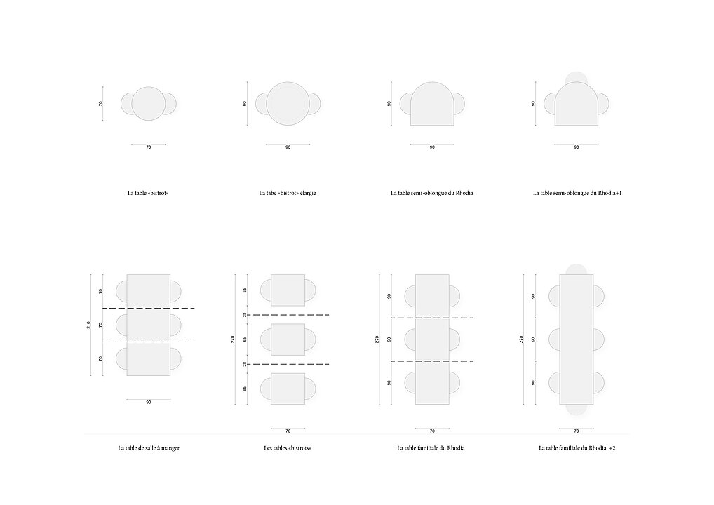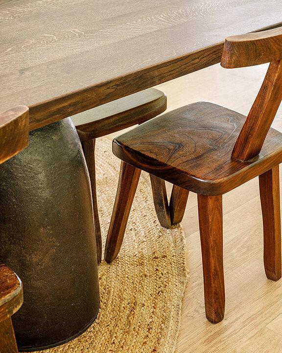 Dans une approche holistique, le studio SAME y conçoit entre autres des pièces de mobilier uniques. Des tables semi-circulaires en travertin sont disposées aux quatre points cardinaux du restaurant tandis que deux grandes tables familiales en céramique et bois, trônent au centre de l’espace. Ces dernières dont les piètements ont été façonnées selon une méthode vernaculaire par le céramiste Cyril Dennery, se jouent du matériaux terre pour se muer en support organique de plateaux en chêne.