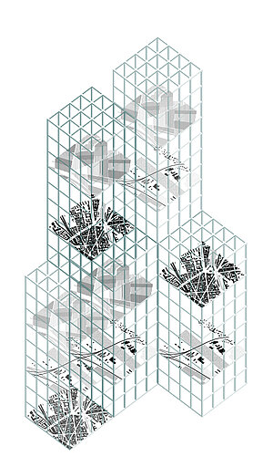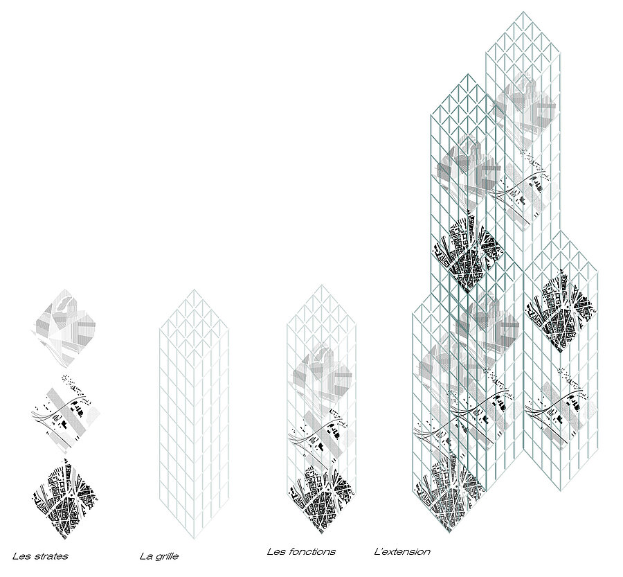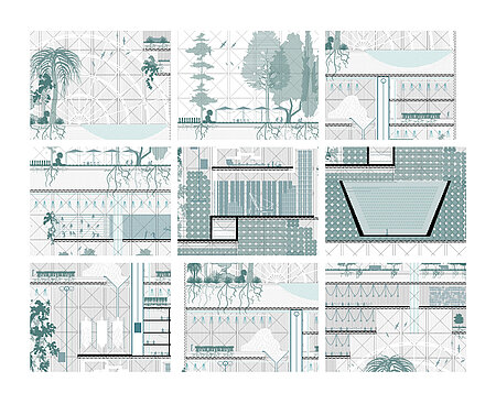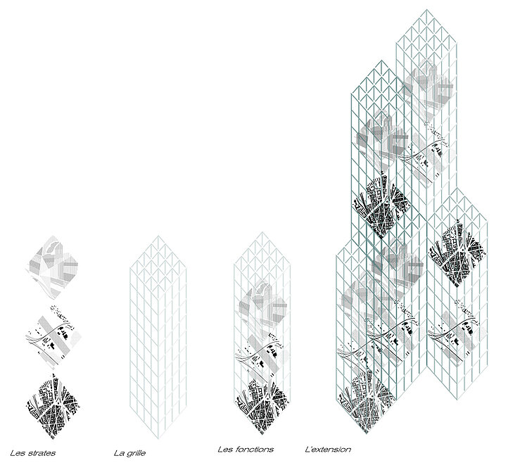 Elle se développe à partir d’une grille infinie, structure générique légère qui lui permet d’évoluer au fil des besoins de la ville. Ce support fédère différents programmes jusqu’alors mis à distance les uns des autres : élevage, production végétale, nettoyage, stockage. Grâce à l’infinitude de son déploiement, il condense en son sein ces besoins grandissants.