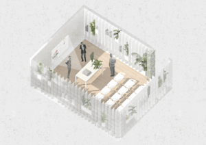 Les salles de réunion sont conçues sur la modularité des espaces de travail et de repos lié à la biophilie. Au sein d’une enceinte de verre, une structure légère de panneaux résillés fixés sur pivot, se déploie pour filtrer l’environnement des bureaux. A celle-ci, se joignent des bacs amovibles de plantes qui permettent de régir l’espace en fonction des différents temps de travail.